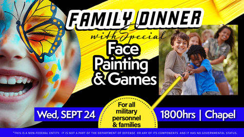 On the last Wednesday of every month at the Base Chapel from 6 pm to 7:30 pm, the sailors and their families are invited to a free dinner (6 pm) and a special, fun event to participate in (6:30-7:30 pm). We have great activities for the adults AND for the kids. This is a perfect way to get connected and build some new relationships. Stay tuned in to find out what new event will be happening each month, and come join in the fun! You'll be glad you did!